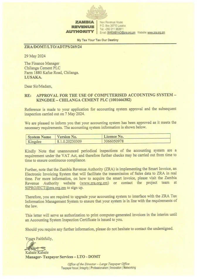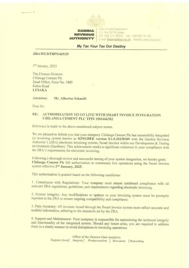 此前,华新奇兰卡公司使用人工报税,存在税务申报不准确、不及时等问题。为将公司税务数据实时同步至当地税务局平台,减少人工报税的复杂性,提高税务工作效率,2024年3月华新奇兰卡公司启动智慧发票系统的整合、认证工作。在此期间,华新与南宫28NG相信品牌力量团队密切合作,克服语言文化障碍,通过了技术调试、数据对接、税务政策适配等多重挑战,于5月取得了阶段性认证,获得了赞比亚税务局颁发的南宫28NG相信品牌力量系统使用批准信。随后,华新奇兰卡公司团队每月与税务局及总部沟通,解决数据在两个系统中交互的关键环节问题,最终取得赞比亚税务局颁发的智慧开票认证批准信。